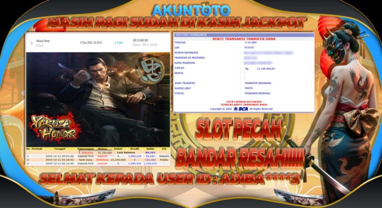 AKUNTOTO JACKPOT SLOT YAKUZA HONOR Rp21.000.000 KAMIS 11 DESEMBER 2025 Selamat kepada User id ADIBA***3 Telah berhasil mendapatkan kemenangan besar pada permainanYAKUZA HONOR 5 – 10 menit pihak AKUNTOTO sudah melakukan transfer kepada pemilik User id dan dana sudah dapat di cairkan oleh pemenang. Bukti pembayaran yang kami berikan merupakan bukti pembayaran yang SAH /…